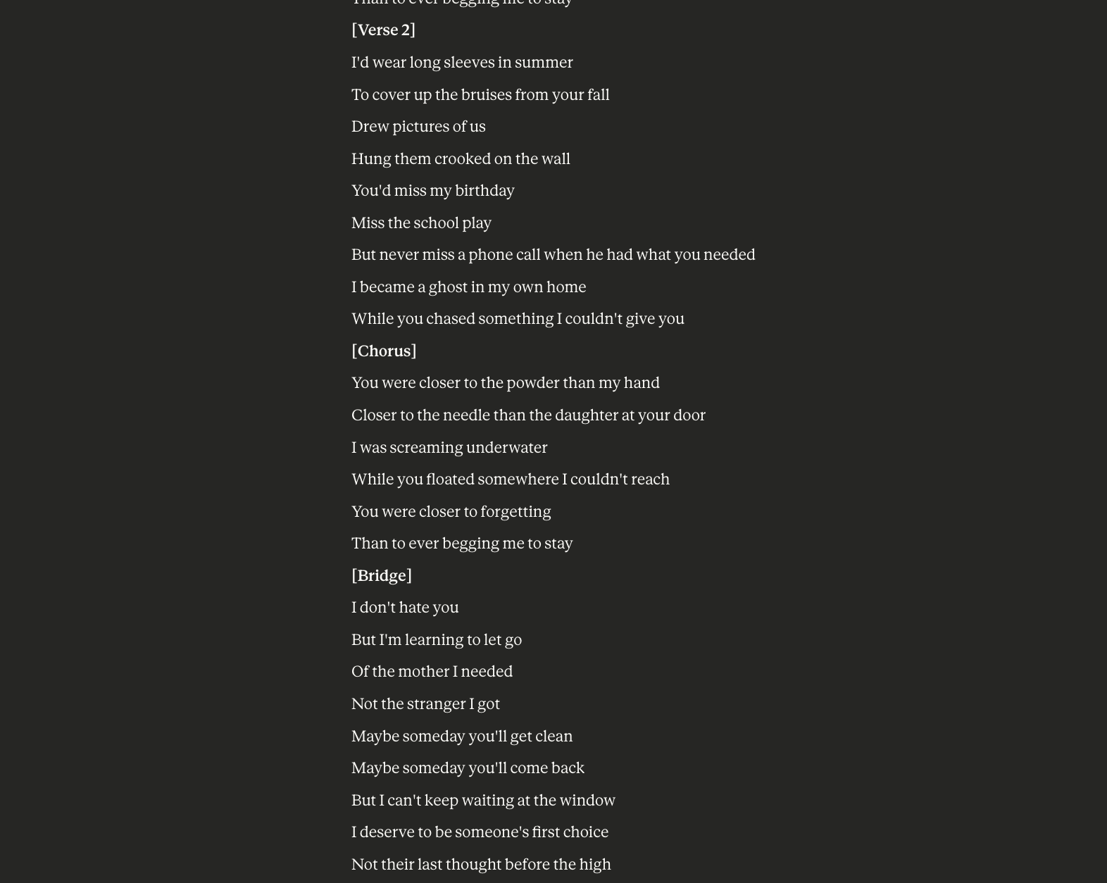 “My name is Luna Raye. My mother used to battle drug addiction. She felt closer to drugs than to me, her own daughter. So I wrote the song "Closer" to work through the pain how it was growing up with a mother that priorities drugs over loving you.”