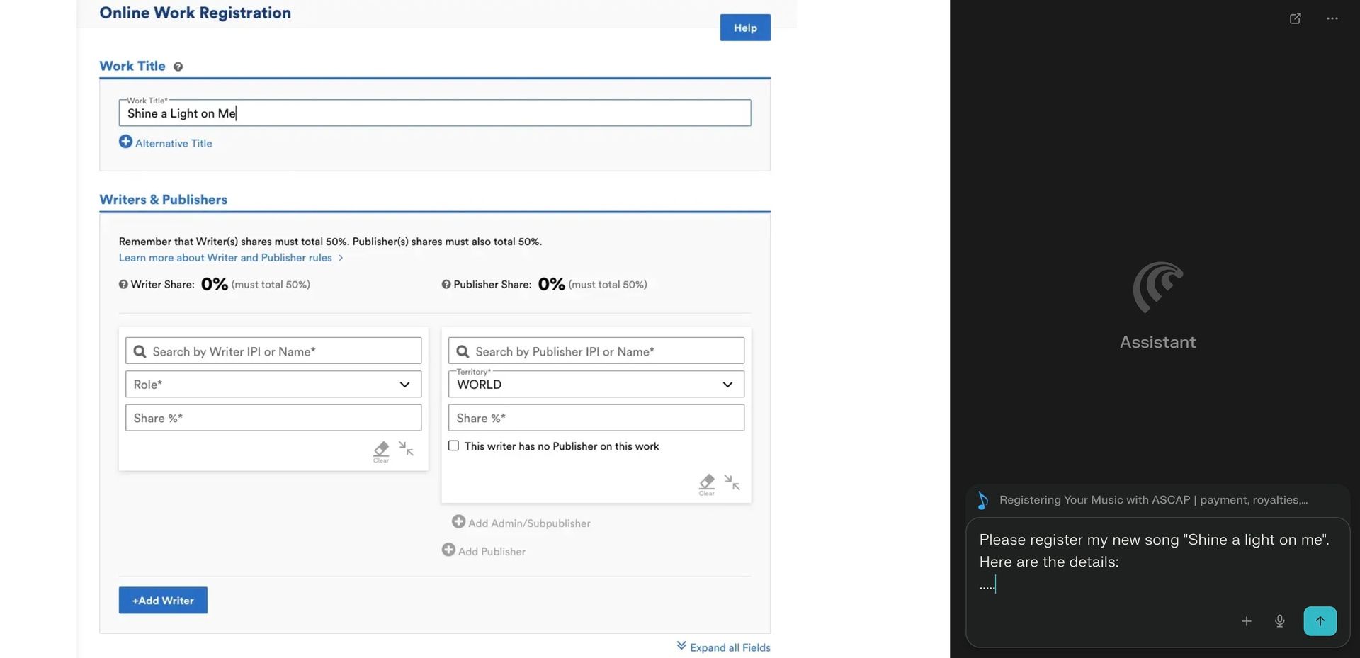 Want to register new music with ASCAP? Log in, give Comet your track details, and it fills everything out.