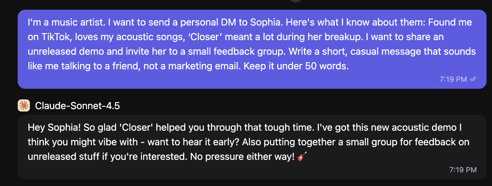 I'm a music artist. I want to send a personal DM to [Fan Name]. Here's what I know about them: [paste notes]. I want to [e.g. share new demo / follow up on previous conversation / make an offer for X]. Write a short, casual message that sounds like me talking to a friend, not a marketing email. Keep it under 50 words.ℹ️ How do you use this prompt?